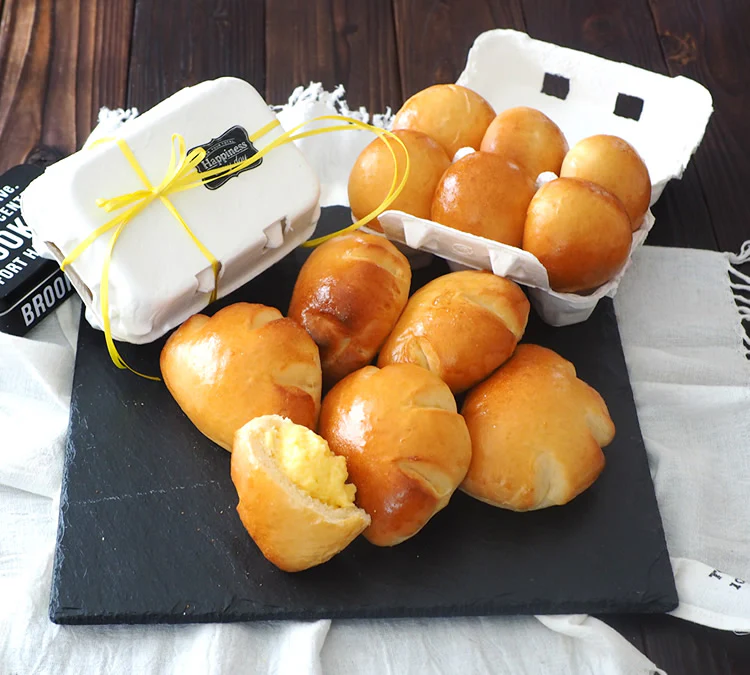 - 生地を麺棒で楕円に伸ばし、カスタードクリームを真ん中に置いて、生地を向こう側に折ります。閉じ目は下に入れ込みます。