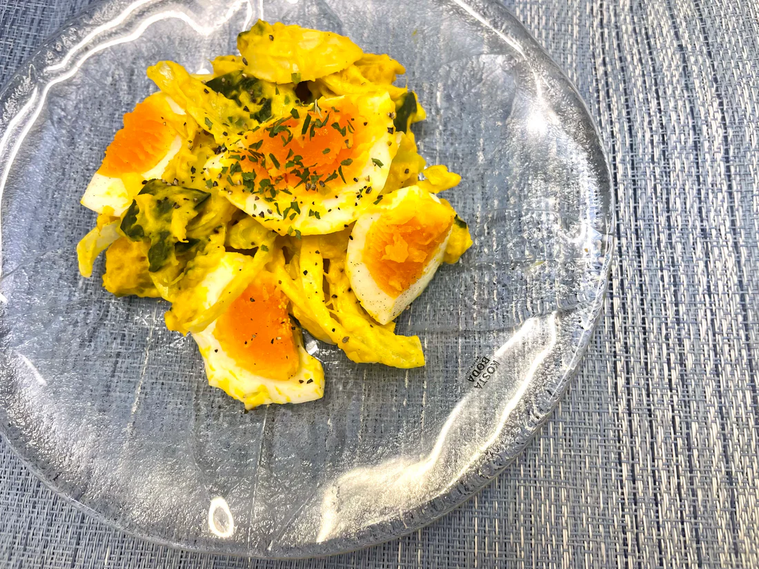 - 半熟ゆでたまご、黒コショウ、パセリを加えて軽く混ぜ合わせ、皿に盛る。