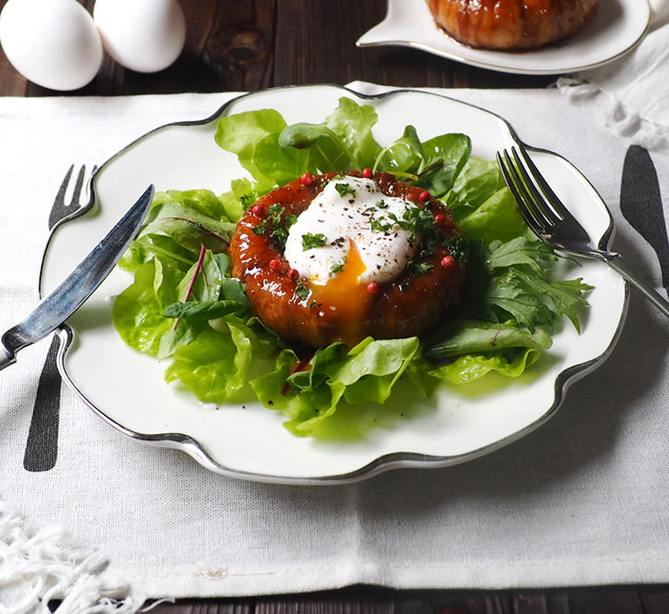 - 7をお皿に盛り、真ん中の穴にポーチドエッグを入れたら完成です。